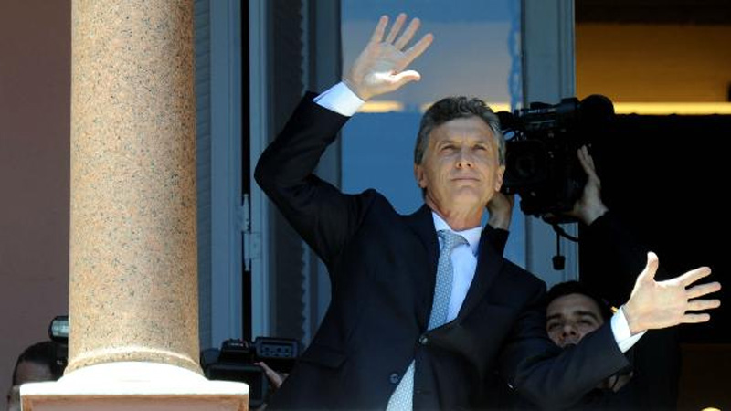 En la Casa Rosada recibió la banda y el bastón presidencial de manos del presidente Provisional del Senado, Federico Pinedo, atributos presidenciales que debieron ser entregados por Cristina, que a esa hora estaba por el aeropuerto tomando un vuelo comercial, en clase turista, a Santa Cruz, su bastión.