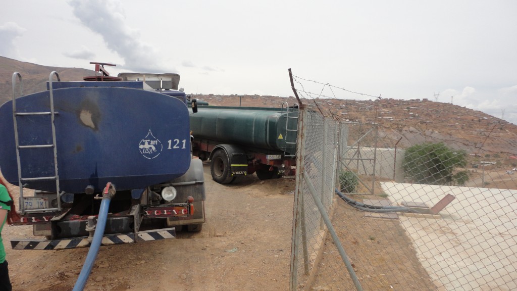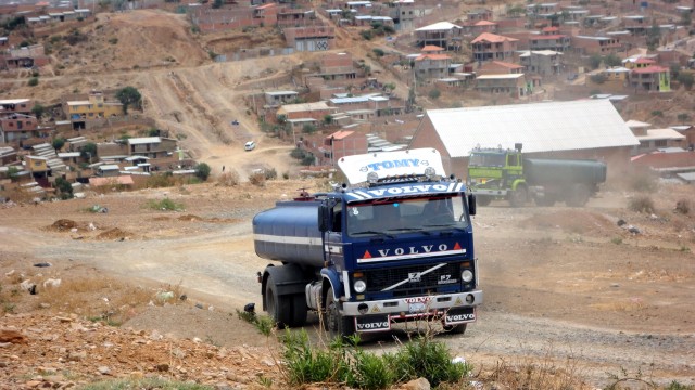 Carro Cisterna. Fotografía: Ida Peñarandaña Corina, es uno de los pocos privilegiados que tiene con un pozo de agua; pero, aún así, no abastece para sus casi 550 afiliados. Por esa razón tienen un carro cisterna que cruza toda la ciudad de Cochabamba para llevar agua hasta el lugar (al sudeste de la ciudad), desde la zona norte, para así cargar el tanque que se encuentra en una colina elevado y distribuir por gravedad el agua. Cada día esta cisterna realiza seis viajes para poder abastecer de agua a todos los usuarios.