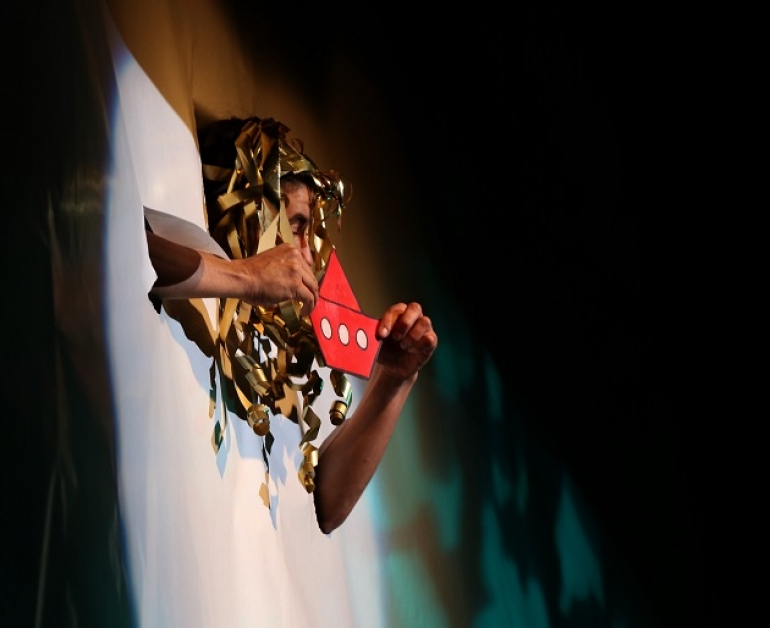 Comienza la obra y golpes agitan el telón para dar paso a un pequeño barco que navega por ese inmenso mar, blanco y vertical. El telón se abre, pero no de la manera convencional, sino por finos cortes en el papel que dejan asomar cabezas, manos y pies de los intérpretes. Éstos emiten sonidos de bebés llorando, bebés riendo que, ayudados por dibujos sobre el papel, hacen tonterías que el público disfruta, tonterías divertidas e inocentes que, a su manera, son totalmente poéticas.