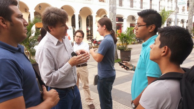 Día de El Desafío. Plaza central. Gutiérrez, acompañada por personal del equipo técnico y de comunicación de Viva, se dispone a demostrar a los activistas de “Más y mejor internet para Bolivia” que nada malo pasa con internet.