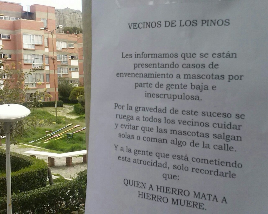 “Quien ha hierro mata a hierro muere”, han escrito en una decena de carteles que alertan sobre el envenamiento de las mascotas y que están colgados por todo el barrio. Probablemente algunos esperaremos que la justicia divina se encargue de quienes cometen actos tan horribles como los que nos ha tocado ver. Sin embargo, si realmente sucediera algo terrible, no será por falta de advertencias.