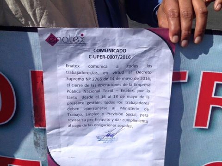 A las 7.00 del lunes, como de costumbre, los casi 800 trabajadores de la Empresa Nacional de Textiles (Enatex) acudieron a cumplir obligaciones en las cuatro distintas plantas de La Paz. Se encontraron con puertas cerradas, policías custodiando los lugares y un aviso de despido. La semana anterior a ese 16 de mayo, la gente no trabajó porque los empleadores estatales les habrían dicho que iban a fumigar las plantas y que pasados los dos días previstos, insistieron en que los tóxicos no se habían disipado, que no se presenten todavía. El sindicato y varios de los afectados, a encontrarse con el mencionado aviso, acudieron al Ministerio de Desarrollo Productivo, en la Av. Mariscal Santa Cruz, para toparse con más policías resguardando el edificio. "Nos han fumigado a nosotros, nos mintieron", se quejaba Franklin Roque, trabajador de la hilandería. Unas mujeres, que pertenecen a la sección de confecciones, se preguntaban: ¿Seremos nosotras los ratones y cucarachas?, así nos trata este gobierno".