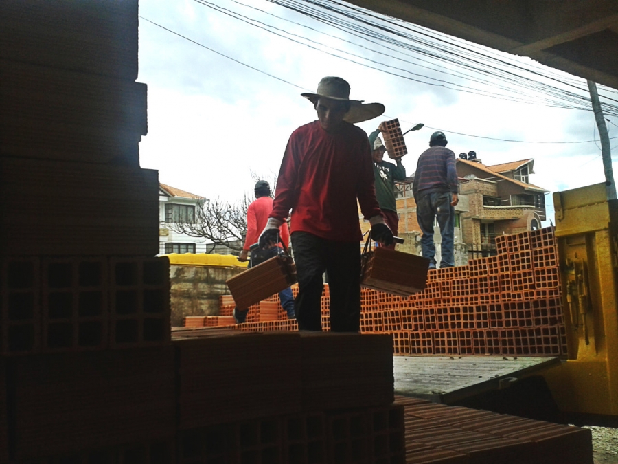 Imágenes como ésta se han vuelto muy comunes en Cochabamba. El crecimiento del mercado de la construcción parece imparable. Algunos lo atribuyen a las remesas, otros a la bonanza económica, otros a la inyección de recursos que se originan en el narcotráfico y muchos otros a los préstamos bancarios con tarifas más bajas. Lo cierto es que Cochabamba se expande hacia arriba y, no pocas veces, sin previo aviso, se bloquean las calles mientras se bajan pacientemente los materiales necesarios para la construcción.