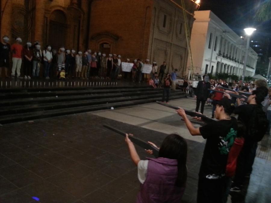 Ayer se cumplieron dos meses de la desaparición de 43 normalistas en Ayotzinapa. En Santa Cruz, el colectivo ARTErias Urbanas convocó una acción en la plaza 24 de septiembre en la que 43 personas se pusieron en las escaleras de la catedral, cada uno con una careta con el rostro de unos de los 43 desaparecidos. Un grupo de percusión y un pelotón de fusilamiento se pusieron frente a ellos, comandados por otro personaje que portaba la careta del presidente mexicano, Enrique Peña Nieto. Cuando ordenó fuego, los tambores pararon y el pelotón, en vez de disparar, levantó sus armas. Los 43, uno a uno, se fueron sacando la máscara y leyendo el nombre de aquel a quien representaban. Casi todos añadieron una frase, como "les seguimos esperando" o "queremos justicia". Al final, se lanzaron 23 preguntas: "¿Por qué 43 jóvenes han sido secuestrados o acaso asesinados?" "¿Por qué nada sabemos de 43 jóvenes de entre 18 y 33 años desde hace dos meses?"...